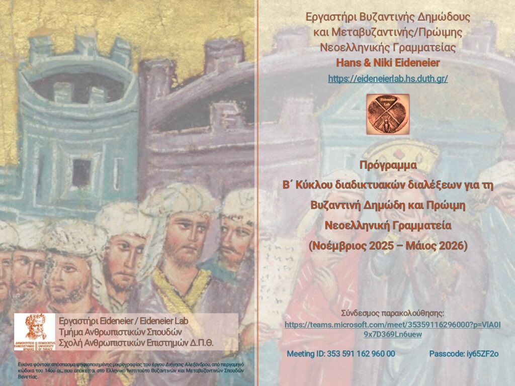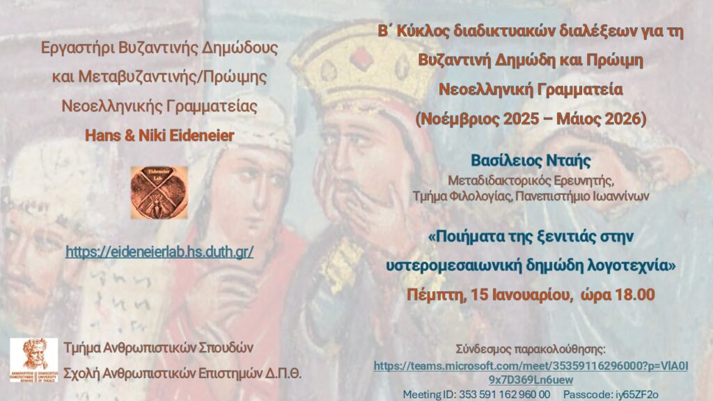 στο πλαίσιο του Β΄Κύκλου διαδικτυακών διαλέξων του Εργαστηρίου Eideneier για τη Βυζαντινή Δημώδη και Πρώιμη Νεοελληνική Γραμματεία.